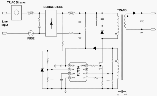 為幫助設計人員解決這些問題,飛兆半導體公司開發出帶有功率因數校正(PFC)、TRIAC和模擬調光能力的FL7730單級初級端調節(PSR)控制器。該款驅動器采用獨特的模擬感測技術,可在從0至100%光輸出的整個范圍內實現無閃爍的TRIAC調光控制。FL7730調光電壓形成內部CS補償以降低調整輸出電流,調光能兼容市場80%以上調光器產品。
