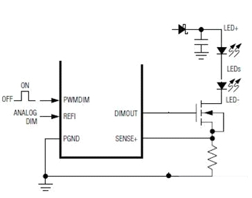 然后用一個PWM信號加到MOS管的柵極,以快速地開關這串LED。從而實現調光。也有不少恒流芯片本身就帶一個PWM的接口,可以直接接受PWM信號,再輸出控制MOS開關管。