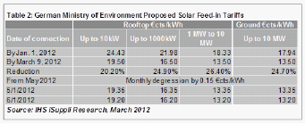 根據新方案,10MW以上的大型系統從3月9日開始將得不到任何FIT。另外,從2012年5月1日開始,每千瓦時電費將每月下降0.0015歐元,代替每年通常在1月降低FIT的做法。