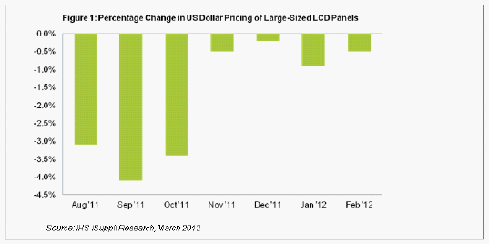 同時,一些面板廠商報告稱2月產量增加,盡管去年泰國洪災導致的硬盤短缺將在2012年上半年影響監視器和筆記本電腦的生產。監視器和筆記本電腦是大尺寸液晶面板三個應用領域中的兩個。