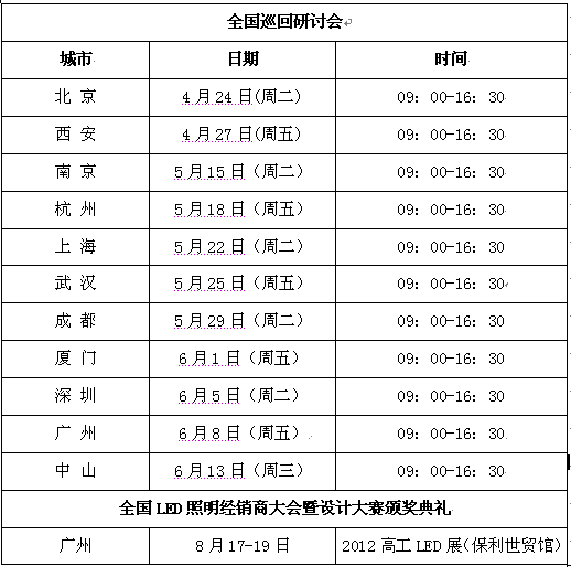 整個巡回研討會暨大賽將持續5個月時間,3月份為活動啟動宣傳階段,4-5月份為全國巡回研討及大賽報名階段,6‐8 月份為大賽作品提交及評審階段。巡回總結大會暨設計大賽頒獎典禮將于2012 高工LED 展期間(8 月17 日)在廣州保利世貿館召開。