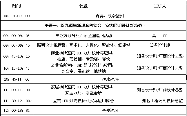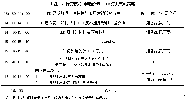 2012是高工LED的渠道年、服務年,為推廣LED照明節能產品,分享LED照明設計理念,增進LED照明廠商、設計師、工程商、經銷商之間的交流與合作,推動LED燈具在家居、酒店、別墅會所、商場鋪、專賣店、餐飲、辦公、展館、地鐵站等室內照明中的應用。高工LED將進行第三次長征(2010年全國LED產業調研、2011年全國燈具城調研),由高工LED、高工LED商城、《高工LED產品與市場》雜志聯合全國各地室內裝飾設計協會、建筑設計機構、照明及LED行業協會共同舉辦的“2012 LED照亮中國之旅”渠道開拓活動-室內LED照明設計全國巡回研討會暨全國室內LED照明設計大賽,將于4‐8月在北京、西安、南京、杭州、上海、武漢、成都、廈門、深圳、廣州、中山11個重點城市舉辦。整個巡回研討會將有全國近1500名來自設計機構、工程公司、經銷商等單位專業人士參加,活動將覆蓋超過20萬設計、工程、經銷等各渠道群體。