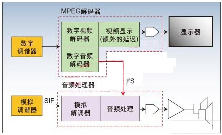在從模擬電視向數(shù)字電視轉(zhuǎn)變的過(guò)程中,電視機(jī)也需要能夠同時(shí)處理模擬和數(shù)字音頻。模擬電視信號(hào)中的音頻要使用一個(gè)子載頻,而模擬調(diào)諧器通常有一個(gè)需要被解調(diào)的聲音中頻(SIF)輸出。DTV平臺(tái)通常有一個(gè)用于解調(diào)來(lái)自模擬調(diào)諧器的SIF輸出的模擬輸入端和一個(gè)來(lái)自解碼器的數(shù)字輸入端,后面的解碼器用于處理MPEG數(shù)據(jù)流中的視頻和數(shù)字音頻(圖2)。