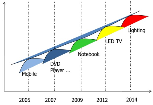 綜觀LED的發展過程,2002年起LED從小尺寸顯示器(主要應用在手機上)開始滲透,在2005年達到高峰。但是隨著效率的提升,單位顯示器使用的LED顆數也逐漸減少。當手機成長趨于飽和狀態下,LED總需求量便開始下滑。在此時LED便開始尋找下一個應用:中尺寸顯示器。隨著性價比的不斷提升,LED于2007年在中尺寸顯示器的需求達到飽和,與先前小尺寸一樣LED需求開始往下。LED開始進入到另一個應用:筆記本電腦顯示器,并于2009年底開始進入電視顯示器的應用。隨著LED在大尺寸顯示器的廣泛應用,LED的性能已經提升到每瓦100流明以上,而價格也快速下降,此趨勢對于LED在照明應用的發展有著無比的助力。