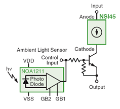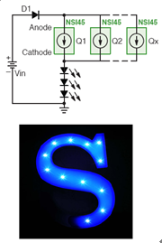 NSI45的另一個典型應(yīng)用是用作顯示屏和廣告牌文字電路的恒流穩(wěn)流器線性LED驅(qū)動器。其特點包括低啟動電壓,無論正向電壓(Vf)如何變化都可以實現(xiàn)精密穩(wěn)流,具有負溫度系數(shù)特性,可以保護LED。