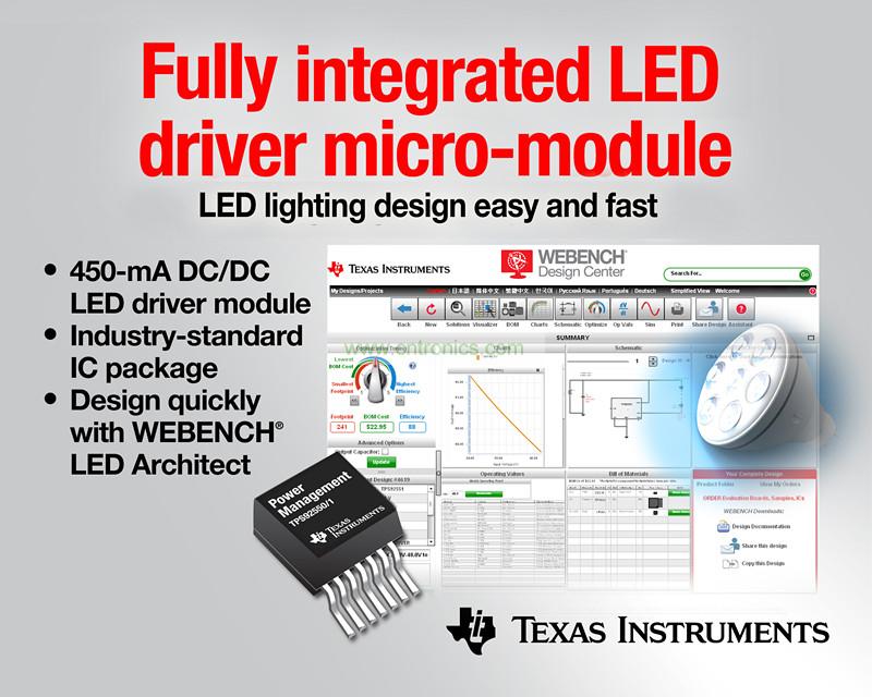 日前,德州儀器 (TI) 宣布推出兩款全面集成型 LED 驅動器微型模塊,其可消除 LED 驅動器設計中常見的外部組件及復雜布局安放問題。該 450 mA TPS92550 及 TPS92551 DC/DC LED 驅動器模塊是業界率先采用統一 IC 封裝集成所有所需電源及無源電路系統的產品,可為 LED 實現高達 23 W 的功率。如欲了解更多詳情,訂購樣片與評估板,敬請訪問:http://www.ti.com.cn/product/cn/tps92550。觀看視頻,請點擊:http://www.ti.com/tps92550-prv。