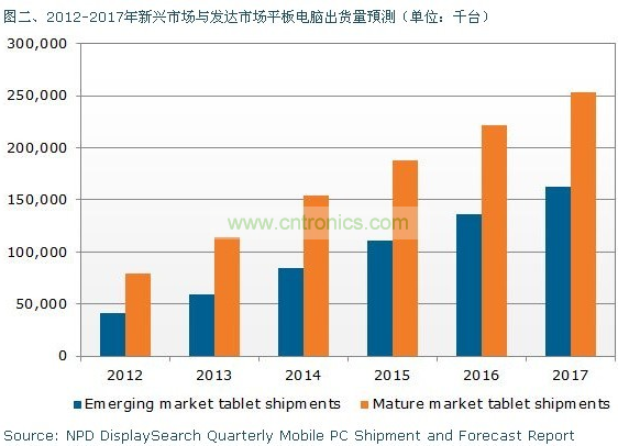 筆記本電腦出貨量預(yù)計從2012年的2億800萬臺增長到2017年的3億9千300萬臺,而平板電腦出貨量預(yù)計將同期從1億2千100萬臺增長到4億1千600萬臺,年復(fù)合增長率將達(dá)28%。平板電腦成長的主要動力來自于在發(fā)達(dá)市場的應(yīng)用增長(包括北美、日本和西歐),2012年該市場平板電腦的出貨占比為66%,并且在整個預(yù)測期內(nèi)占比也將保持在60%左右。平板電腦在發(fā)達(dá)市場的出貨量預(yù)計將從2012的8千萬臺增長到2017年的2億5千400萬臺。
