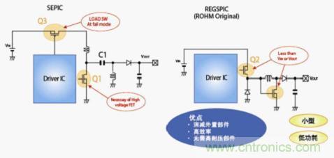 面對車載特有的電池電壓波動和多樣化的LED燈數(shù),以升壓方式和降壓方式很難進(jìn)行LED的閃爍控制與平臺設(shè)計(jì),要滿足市場所要求的高可靠性與縮短開發(fā)周期之間的平衡實(shí)屬不易。因此,為了不依賴電池電壓、可以始終穩(wěn)定供給DC/DC轉(zhuǎn)換器輸出電壓,ROHM采用了一種稱為“REGSPIC結(jié)構(gòu)”的獨(dú)有升降壓方式。下面介紹REGSPIC結(jié)構(gòu)與一般的升降壓方式所用的SEPIC結(jié)構(gòu)相比所具有兩個優(yōu)點(diǎn)。