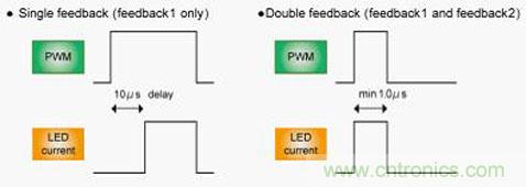 在沒有另外的反饋通路時,從PWM=OFF→ON時點(diǎn)開始,到生成LED電流會產(chǎn)生約10μs的延遲時間。與此相比,在有另外的反饋通路時,幾乎沒有延遲時間,可跟隨到最小達(dá)1μs的PWM脈沖寬度。假設(shè)PWM頻率為100Hz,那么如果是1μs的脈沖寬度,則可實(shí)現(xiàn)10000:1的調(diào)光率。綜上所述,BD81A34EFV-M實(shí)現(xiàn)了高調(diào)光率,非常有助于面板的高亮度化。
