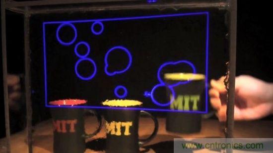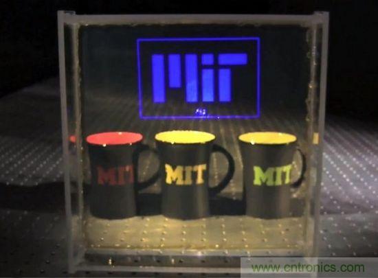 MIT的研究小組,已經(jīng)利用市售的納米銀粒子打造出了一套概念驗證系統(tǒng)。最終效果如下圖所示(散射的藍(lán)光部分)。當(dāng)然,如果利用納米粒子分別調(diào)諧紅/綠/藍(lán)3色光的話,就能夠?qū)崿F(xiàn)全彩顯示。