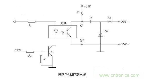 限于篇幅有限,下面僅對此PWM控制電路進行簡單的介紹:當PWM控制信號為低電平時,晶體管T1處于截止狀態,光電耦合器中發光二極管的電流近似為零,輸出端Q1和Q2間的電阻很大,相當于開關“斷開”;當PWM波控制信號為高電平時,晶體管T1處于導通狀態,光電耦合器中發光二極管發光,輸出端Q1和Q2間的電阻很小,相當于開關“導通”.由上面介紹可知,當DS18B20采集的實時溫度小于制冷啟動溫度時,光電耦合器的PWM輸入端無信號輸入時,光電耦合器處于不工作狀態,圖5中的OUT+端和OUT-端無輸出電壓,即半導體制冷片處于閑置狀態;當DS18B20采集的實時溫度大于制冷啟動溫度時,光電耦合器的PWM輸入端有信號輸入,圖5中的OUT+端和OUT-端即有輸出電壓。通過PWM調制波控制Q1和Q2兩端的通斷,即可實現對半導體制冷片TEC工作電壓的控制,進而控制了半導體制冷片TEC的散熱功率。圖5中的OUT+端和OUT-端分別接在半導體制冷片TEC的輸入端線上。根據CUK電路的輸出電壓和供電電源電壓的關系,可得出PWM波占空比和半導體制冷片TEC輸入電壓的關系: