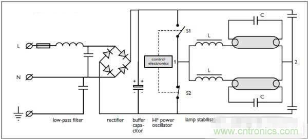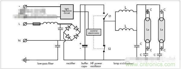 熒光燈的調(diào)光(1-10V)熒光燈的調(diào)光是在高頻電子鎮(zhèn)流器的基礎(chǔ)上研發(fā)出來的。下面是高頻電子鎮(zhèn)流器的線路圖: