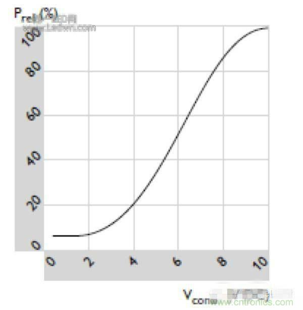 6)調(diào)光范圍0.1%-100%,最低限值取決于供應(yīng)商,調(diào)光曲線標(biāo)準(zhǔn)化且適應(yīng)人眼的敏感度(下圖:對數(shù)調(diào)光曲線);