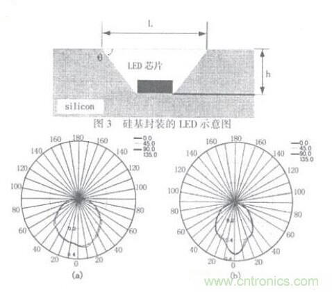 MEMS技術(shù)是隨著半導(dǎo)體和微電子技術(shù)的發(fā)展麗發(fā)展起來(lái)的一項(xiàng)新興的細(xì)微加工技術(shù),加工尺寸從毫米到微米數(shù)量級(jí),甚至亞微米的微小尺寸:其加T藝主要分為表面工藝和體工藝。基于硅基的體工藝又稱為體硅工藝,體硅工藝呵以在硅基體上形成高深寬比的凹稽。由于MEMS的加工尺寸很小,因此利用該技術(shù)形成的微小凹槽作為L(zhǎng)ED芯片封裝的反射腔(如圖3),將會(huì)克服目前LED芯片直接封裝在PCB板上而引起發(fā)光效率低的問(wèn)題;同時(shí)由于硅具有良好的導(dǎo)熱特性,因此可以降低目前封裝中熱阻高的問(wèn)題,從而提高LED芯片的發(fā)光效率和可靠性。圖4(a)和(b)給出了當(dāng)LED芯片直接貼裝在PCB板上和貼裝在有凹槽的硅基上的發(fā)光特性。從圈中可以看出,LED貼裝在帶有凹槽的硅基上以后其發(fā)出光的發(fā)散性能得到了很大的改善,LED的發(fā)光強(qiáng)度提高了75%以上。