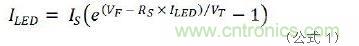 下面是圖1a行不通的原因所在。在公式1中,IS、RS是常數(shù),取決于LED產(chǎn)品本身,與VT是熱電壓無(wú)關(guān)。假設(shè)串聯(lián)電阻RS是理想值零,那么僅0.1V的VF變化就會(huì)產(chǎn)生47倍的ILED差異。