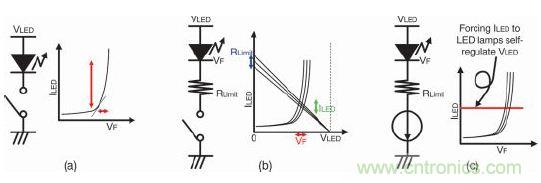 現(xiàn)在我們來(lái)看看圖1b。添加一個(gè)限流電阻器RLIMIT來(lái)保護(hù)LED燈。由于有限流電阻器,因此該燈不會(huì)被燒壞。在視頻顯示器應(yīng)用領(lǐng)域,這種方法在控制LED光強(qiáng)度方面仍然不夠好。LED曲線(xiàn)和RLIMIT產(chǎn)生的負(fù)載曲線(xiàn)可決定其LED電流值。如紅色或藍(lán)色標(biāo)記所示,該LED和電阻器分別存在制造誤差造成的正向電壓變化及電阻變化。這些誤差因素會(huì)使LED電流(綠)產(chǎn)生不可忽視的變化。