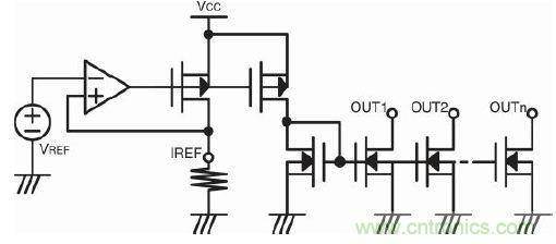 此外,我們都知道集成電路(IC)可提供良好的匹配電路對(duì)。這也是選擇恒流法的另一個(gè)優(yōu)勢(shì)。圖2是LED驅(qū)動(dòng)器的基本輸出級(jí)結(jié)構(gòu)。市場(chǎng)上很多LED驅(qū)動(dòng)器IC都有參考電流設(shè)置端 IREF,該參考電流是鏡像到其輸出端的恒流。