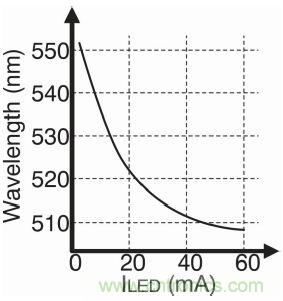 這時(shí)候,需要考慮電流變化對(duì)LED光輸出波長(zhǎng)值的影響。改變波長(zhǎng)就意味著改變?nèi)搜劭吹降纳省D4是綠色LED燈的實(shí)例。通常在業(yè)界,510nm 廣泛代表綠色。因此,大部分LED燈制造商所設(shè)計(jì)的LED燈產(chǎn)品在最大額定電流下都具備510nm的波長(zhǎng)。在圖4中,隨著LED電流的升高,波長(zhǎng)可達(dá)到510nm。獲得綠色的最佳方法是盡量使燈的驅(qū)動(dòng)電流接近最大額定值。這也就說(shuō)明了為什么使用數(shù)字控制比使用模擬控制好。