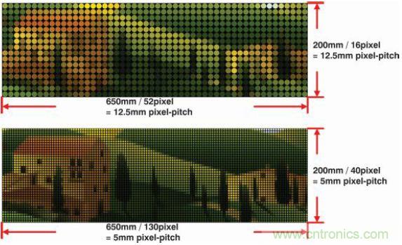 例如,5m視距的系統(tǒng)需要5mm像素間距來(lái)實(shí)現(xiàn)良好分辨率。另一個(gè)視覺(jué)實(shí)例如圖7所示,圖中展示了過(guò)低像素間距如何降低輸出影像質(zhì)量。像素間距為12.5mm 的影像(上)看起來(lái)很粗糙,無(wú)法近距離辨識(shí)。但保持一定的距離觀(guān)看時(shí)影像開(kāi)始變得清晰,與觀(guān)看像素間距為5mm的影像(下)類(lèi)似。這個(gè)實(shí)例清楚地說(shuō)明了視距與像素間距的關(guān)系。