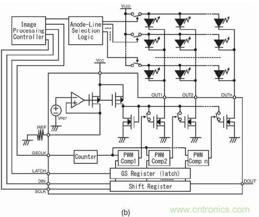 圖11b是采用PWM控制IC的系統(tǒng),具有一個(gè)可參考時(shí)鐘計(jì)數(shù)器的灰階參考時(shí)鐘輸入端。另外,該IC還具有一組保存灰階邏輯代碼的寄存器。PWM 比較器可通過(guò)計(jì)數(shù)器和灰階 (GS)寄存器比較和生成PWM輸出模式。