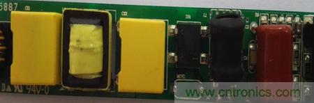 7、在輸入AC265V時實際測量開關管DS極之間最高峰值電壓有524V,而開關管DS極之間的距離僅有0.67mm,安全距離明顯不夠,因此很容易造成炸機現象,特別是在助焊劑不純的情況下,DS極之間會形成一個電阻,那就更加容易出現炸機現象。改善對策是重新修改PCB將開關管的引腳改為品字形設計,加大安全距離。