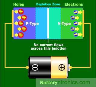 如果嘗試使電流向其它方向流動,P型端就邊接到電流負極和N型連接到正極,這時電流將不會流動。N型物質的負極電子被吸引到正極電子。P型物質的正極電子空穴被吸引到負極電子。因為電子空穴和電子都向錯誤的方向移動所以就沒有電流流通過匯合處,損耗區增加。