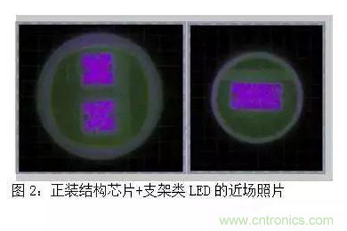 這類芯片廣泛被中低功率的封裝產品所采用,優(yōu)點是價格低;缺點是由于藍寶石導熱性能差,所以芯片散熱較差,P型材料的導電性也較差,因此注入電流受到限制。此外,芯片是五面發(fā)光的,通常需要將將芯片置于支架內,如圖2所示,反光杯的開口面積遠大于芯片發(fā)光面積,導致單位面積光通量低,芯片表面顏色均勻性非常差,芯片正上方偏藍,而外圈偏黃。這就是在使用中,如射燈、平板燈等,出現(xiàn)黃圈的原因。