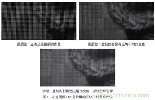 在室內(nèi)應(yīng)用中,LED顯示屏的亮度多介于300到1000尼特(nit),將此亮度轉(zhuǎn)換成LED順向電流,約當(dāng)于1~5mA,甚至小于1mA。因此,驅(qū)動(dòng)芯片的小電流集中度變得很重要。當(dāng)驅(qū)動(dòng)芯片電流精度不佳,小點(diǎn)間距LED顯示屏就容易出現(xiàn)區(qū)塊不均的色塊,然而為掩飾色塊這個(gè)缺陷,通常會(huì)采取提高LED電流這個(gè)手段,來增加顯示屏的亮度。但帶來的缺點(diǎn)是,當(dāng)觀眾注視這個(gè)LED顯示屏一段時(shí)間后,眼睛容易感覺不適。圖1所演示的是小點(diǎn)間距LED顯示屏,在使用不同質(zhì)量的LED驅(qū)動(dòng)芯片時(shí),重制圖像后的實(shí)際差異。