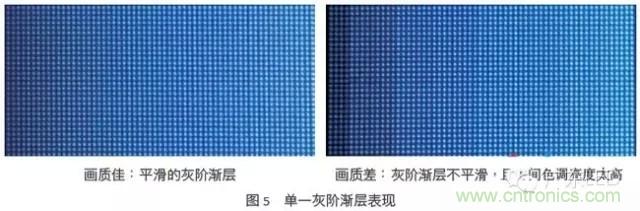 小點(diǎn)間距LED顯示屏為時(shí)序掃描式(multiplexed)的顯示器,非液晶屏幕的hold-type顯示器,所以刷新率對于小點(diǎn)間距LED顯示屏來說相當(dāng)?shù)刂匾^低的刷新率不僅會(huì)使小點(diǎn)間距LED顯示屏觀賞起來有閃爍的不適感,容易使造成觀賞者暈炫,而且會(huì)使灰階漸層的效果不平滑。以圖4為例,右圖臉部的灰階漸層效果較左圖的不平滑,有類似等高線的現(xiàn)象,從圖5的灰階漸層測試畫面也可以看出右圖的小點(diǎn)間距LED顯示屏的連續(xù)性比左圖的差。