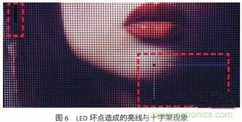 現(xiàn)今的LED磊晶與封裝技術(shù)與日俱增,但LED經(jīng)過長時(shí)間的使用后仍難免會(huì)有損壞,與液晶屏幕不同的是,壞掉的LED會(huì)在小點(diǎn)間距LED顯示屏形成亮線或是十字架,而不是一個(gè)黑點(diǎn),如圖6所示。對LED顯示屏制造商,營運(yùn)商與觀眾而言,都是一大困擾。