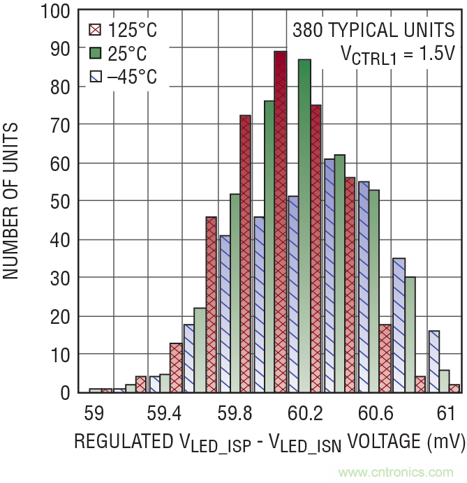 圖 1 顯示了當模擬控制輸入為 0V 時,隨溫度變化 LT3744 失調電壓的生產一致性,在這里,典型器件數量為 380 個。憑借誤差放大器的低失調,控制環(huán)路在 1/20 標度模擬調光時,能夠實現 ±10% 的典型準確度。圖 2 顯示了當控制輸入等于 1.5V 時,穩(wěn)定電壓在多個 LED 電流檢測引腳上的分布。滿標度范圍的準確度好于 ±3%,這相當于在 60mV 滿標度調節(jié)電壓時準確度為 ±1.8mV。
