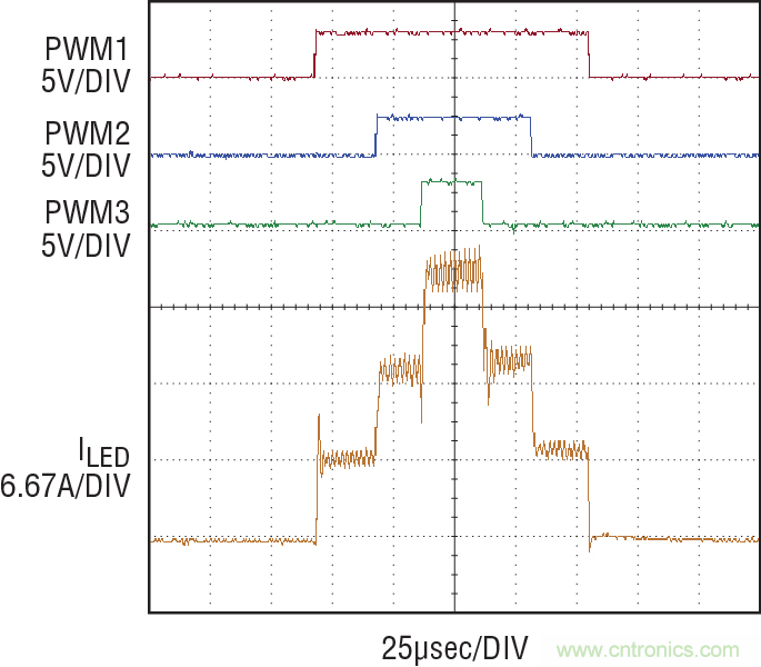 圖 12:在進行 PWM 調光時,LT3744 的并聯驅動器之間實現了出色的 LED 電流均分。
