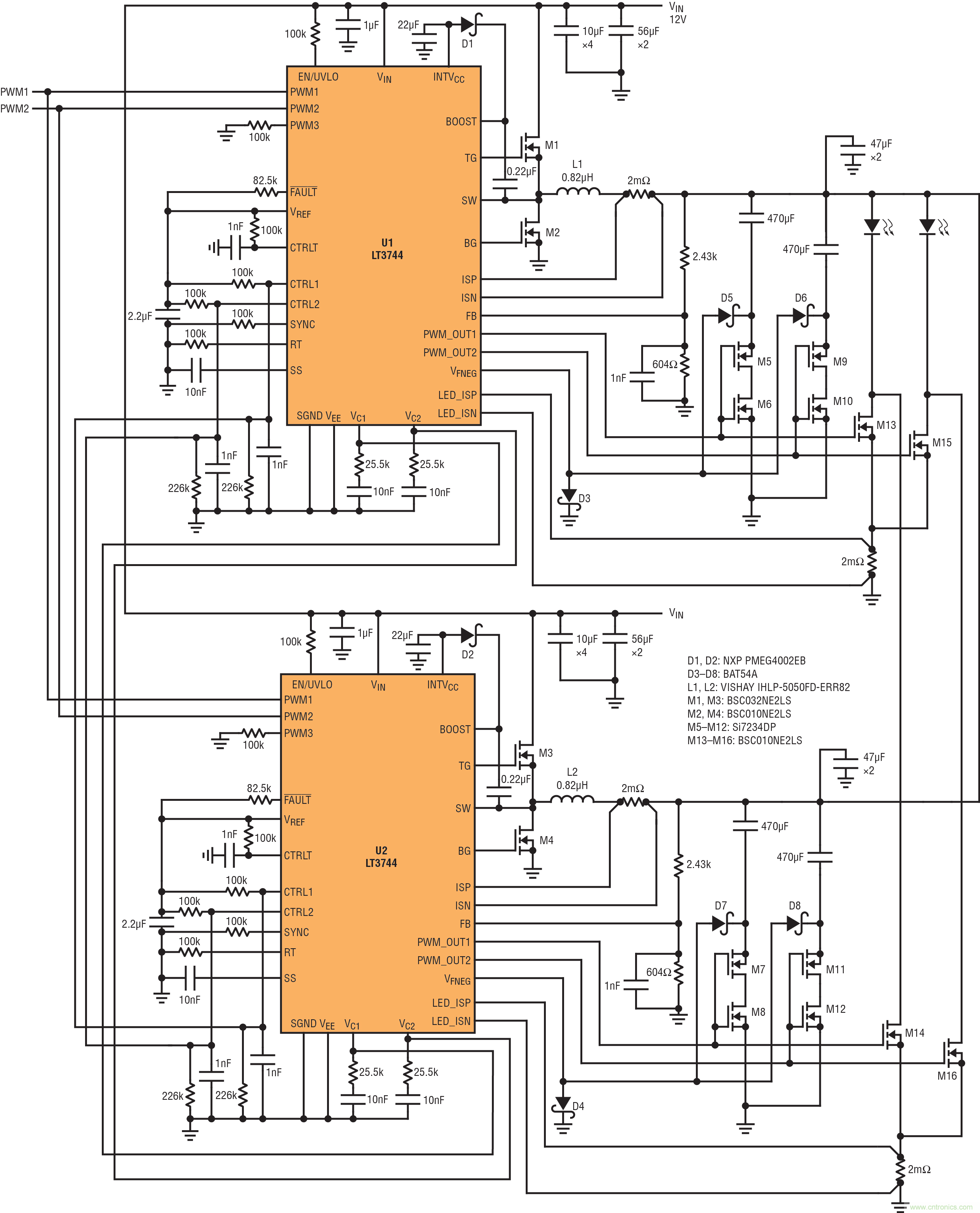 兩個 LT3744 LED 驅動器并聯以組成 324W 雙 LED 驅動器