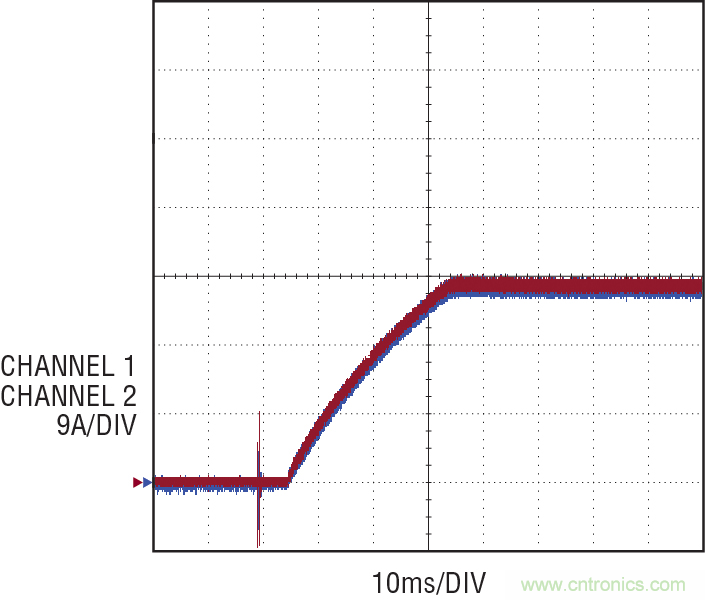 圖 8 顯示了一款 324W 轉換器,由兩個ADI DC2339A 演示電路板并聯組成。在這款設計中,每個并聯的控制器都產生 27A 電流,總共產生 54A 電流,電壓為 6V。通過將相應的補償輸出連接到一起,兩個控制器協(xié)調一致地運行,以提供平滑、良好的啟動和準確的 DC 調節(jié)。