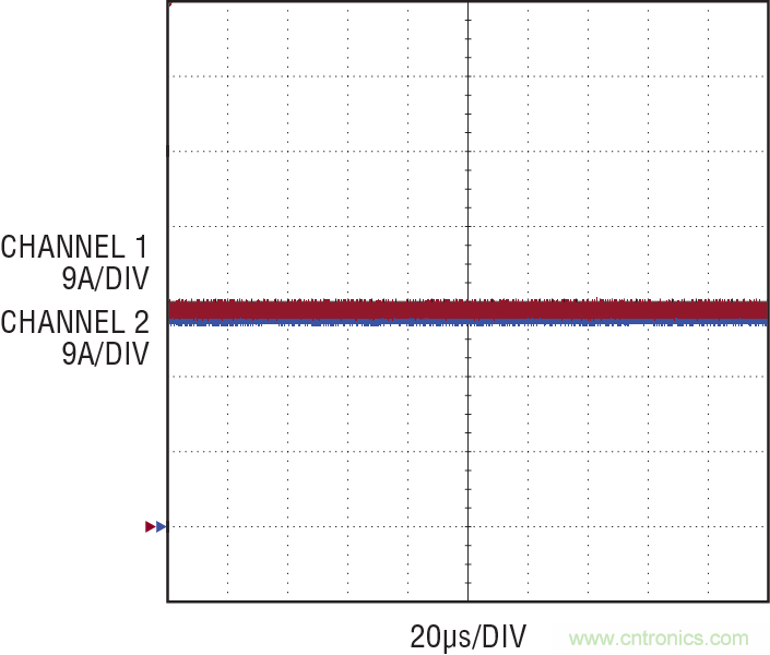 圖 10:在滿負載時 LED DC 電流均分,兩個并聯驅動器之間的電流差別非常小。