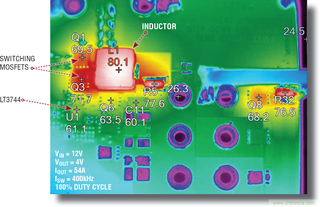 圖 13:50% PWM 調光、向 LED 提供 54A 脈沖電流時,并聯電路板的溫度。