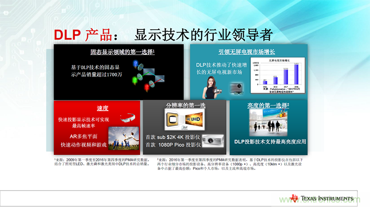“在顯示應(yīng)用領(lǐng)域,DLP技術(shù)涵蓋范圍非常廣,從小巧的口袋型顯示器到高端大型的數(shù)字影院,TI一直保持大量的產(chǎn)品和技術(shù)創(chuàng)新。”Ane Sacks女士在會議中介紹到,“如今,TI已經(jīng)能夠?qū)崿F(xiàn)最高幀速率和最高亮度的快速投影顯示技術(shù),面向快速動作視頻和游戲市場;在面板分辨率上推出了入門級的4K平臺,與此同時在1080P上也有十足的創(chuàng)新,推出了超高性價比的1080p Pico解決方案,未來市場潛力巨大。”