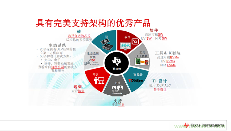 “為加速滲透民用主流市場,TI不僅推出了性能優(yōu)異的產(chǎn)品,還建立了一流的支持架構(gòu),以借助廣大TI用戶加快產(chǎn)品面市。”Ane Sacks女士還表示,“針對TI的IC和DLP芯片組,TI可以提供軟件、工具套件、參考設(shè)計、工程社區(qū)交流、技術(shù)培訓(xùn)以及完善的DLP生態(tài)系統(tǒng)等技術(shù)支持,包含20多家擁有DLP經(jīng)驗的獨立第三方供應(yīng)商以及50多種光學(xué)、電子、軟件等方面的設(shè)計解決方案,能夠?qū)⒆钚碌膭?chuàng)新、產(chǎn)品和應(yīng)用及時、快速地傳遞給客戶。”