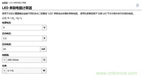為了簡化計算,Digi-Key提供了一個LED串聯電阻計算器,幫您計算電路設計中所需要電阻的阻值和功率。