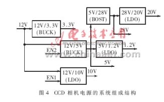 CCD 相機中的圖像信息的流動和變換是通過相機中的FPGA/CPLD時序發生器的驅動和MCU的控制管理下完成的。整個CCD相機正常工作需要以下6種穩壓電源,它們的電壓值和最大輸出電流分別是:28V@30mA、20V@50mA、10V@100mA、5V@20mA、3.3V@300mA和1.2V@30mA。