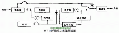 UPS不問(wèn)斷電源是個(gè)特殊的設(shè)備,它既是電網(wǎng)的負(fù)載,又要給負(fù)載提供電源。所以它的EMC設(shè)計(jì)既要保證它不對(duì)電網(wǎng)造成電磁污染,又要保證它提供給負(fù)載的是個(gè)干凈的電源。UPS本身振蕩電路就是一個(gè)干擾源。典型的UPS系統(tǒng)框圖如圖l所示。它的基本結(jié)構(gòu)是一套將交流市電變?yōu)橹绷麟姷恼髌?、充電器和把直流電再變?yōu)榻涣麟姷哪孀兤?,電池在交流正常供電?duì)儲(chǔ)存能量且維持在一個(gè)正常的充電電壓上.一旦市電中斷,蓄電池立即對(duì)逆變器供電 保證UPS交流輸出。
