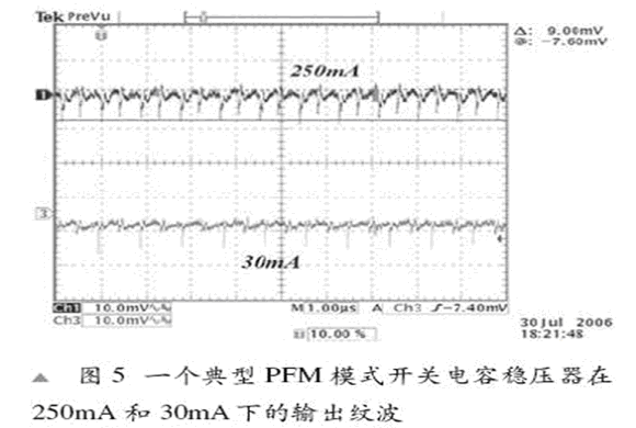 在PFM類系統(tǒng)中,可以感應(yīng)到輸出電壓,當(dāng)這個(gè)電壓高于一個(gè)指定值時(shí),穩(wěn)壓器就會(huì)關(guān)閉,等到輸出電壓降到所需值以下時(shí)再重新開啟。使用PFM控制模式的缺點(diǎn)是工作頻率取于VIN 和 ILOAD ,因此變化不定。負(fù)載越高、工作頻率就越接近指定頻率。這個(gè)操作范圍上的頻率變化在一些便攜式應(yīng)用中可能不大合適。輸入電壓紋波也取決于VIN 和 ILOAD。圖5顯示了250mA 和 30mA 負(fù)載的輸出紋波。10mF COUT 的輸出紋波將為50mV,我們可以看到250mA負(fù)載的紋波頻率高于10mA負(fù)載的紋波頻率。