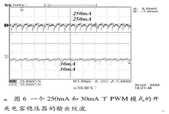 比較新的PWM調(diào)控模式處理了PFM架構(gòu)中的各種頻率和高輸出紋波。大多數(shù)的新型開關(guān)電容穩(wěn)壓器都采用PWM調(diào)制模式。在這種模式下,功率FET的電阻根據(jù)VOUT 和 ILOAD進(jìn)行控制。這樣做,我們就真正控制了快速電容器(CFLY)所提供的充電量。這也被稱為預(yù)調(diào)制。在這種模式下,操作頻率和工作周期都是固定的。一個(gè)PWM架構(gòu)的例子是LM2771,圖6顯示出它的輸出紋波。它處于一個(gè)帶有4.7mF COUT 的8mV -10mV的順序中。我們可以看到在ILOAD變化的情況下紋波可以持續(xù)。一個(gè)9mV的紋波輸出可以與在感應(yīng)開關(guān)穩(wěn)壓器中的紋波相媲美。