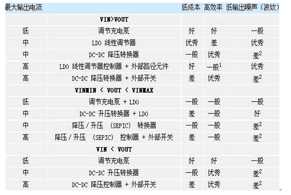 針對應用而選擇最佳的分立 DC/DC 轉換器成為了成本、效率、以及輸出噪聲或波紋之間的一種權衡。表1根據4個因素對比了各種轉換器:最高輸出電流、效率、輸出波紋/噪聲及總成本。