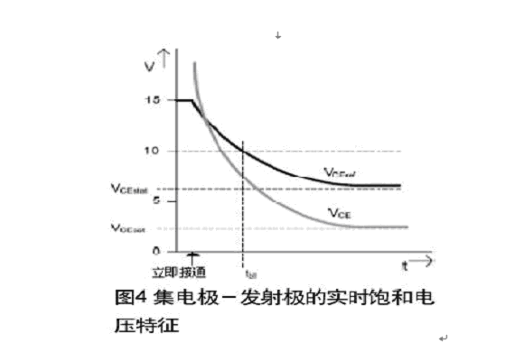 使用信號變壓器(脈沖變壓器)不僅可以提供高質量的電氣隔離,它在原邊與副邊間還有很高的dv/dt(50kv/us)。與光耦構成的驅動電路不一樣的是,信號變壓器可靠性好,號電路通道被互鎖,直到有復位脈沖對該電路進行復位。在IGBT退飽和監視中,必須考慮它的實時飽和電壓特征。在IGBT開通的最初幾個微秒,集電極-發射極電壓遠高于穩定后的VCEsat值。因此監測電路的響應特征在消隱時間內(圖4)必須與VCEsat特征圖一致。
