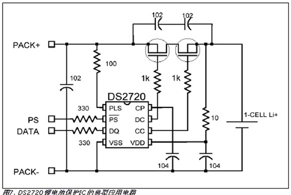 因為Li+電池過充或過放可能會導(dǎo)致爆炸并造成人員傷害,所以使用這類電池時,安全是主要關(guān)心的問題。因此,商用鋰離子電池組通常包括象DS2720這樣的保護(hù)電路(圖7)。