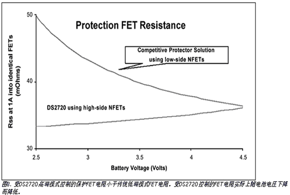 DS2720IC使用外部開關(guān)元件,如低成本n溝道功率MOSFET,來控制充電和放電電流。內(nèi)部9V的電荷泵為外部n溝道MOSFET提供高端驅(qū)動,與常見使用相同F(xiàn)ET的低端保護(hù)電路相比具有更低的導(dǎo)通電阻。FET導(dǎo)通電阻實際上隨電池放電而減少(見圖8)。