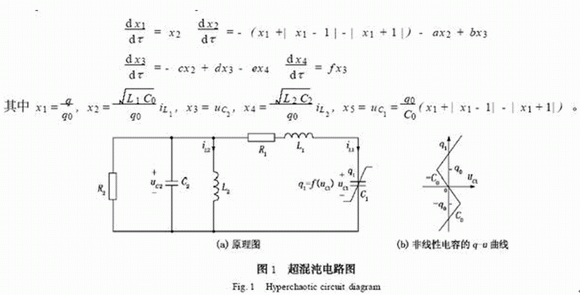 “超混沌電路”由5個線性元件和一個非線性電容元件組成。其電路如圖1(a)所示。圖1(b)為非線性電容元件的庫伏特性。