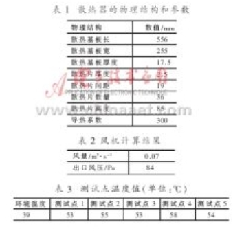軟件計算結果:表1為散熱器的物理結構和參數;表2為風機的風量和風壓計算結果;表3為散熱器上選擇的五個測試點的溫度值。