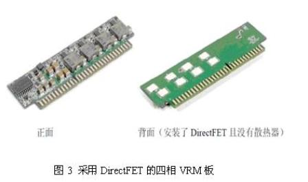 該轉換器將很薄的DirectFET MOSFET安裝于電路板的背部,并在它們的上方安裝散熱器,這種結構符合VRM 9.1外形規范。另外采用電絕緣的導熱環氧樹脂將3.75英寸×0.75英寸的鋁制葉片式散熱器安裝于DirectFET的上方。